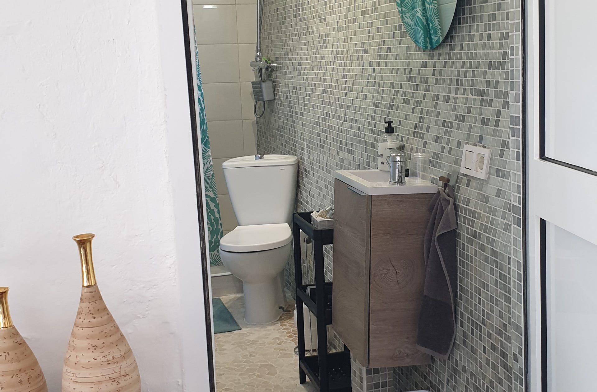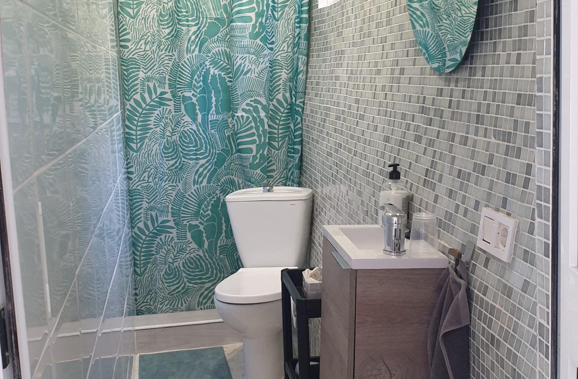 Badkamer met douche en wastafel.
